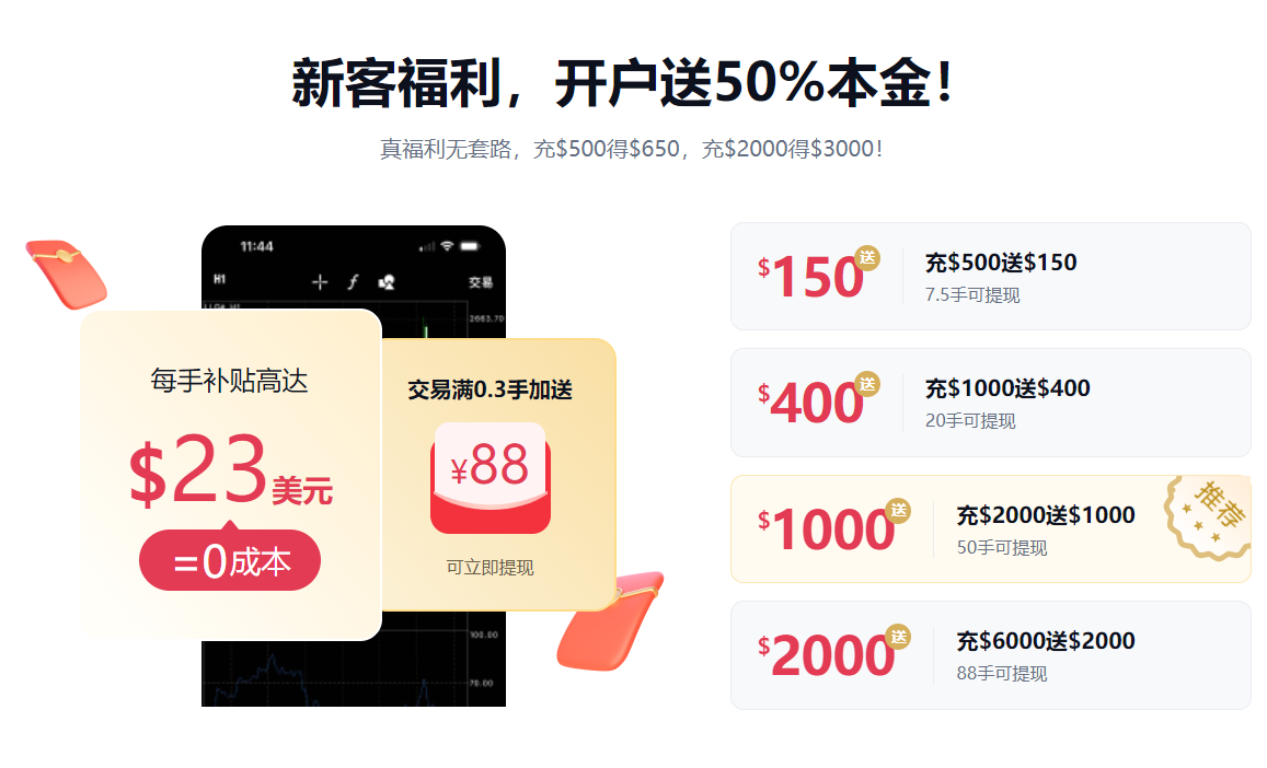 新客户开户即可享受本金膨胀150%赠金福利,最高可获得2000美元赠金,助您轻松开启黄金投资之旅。